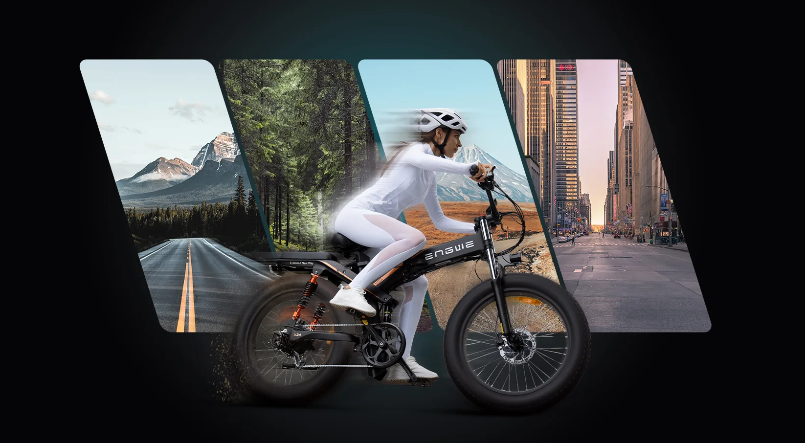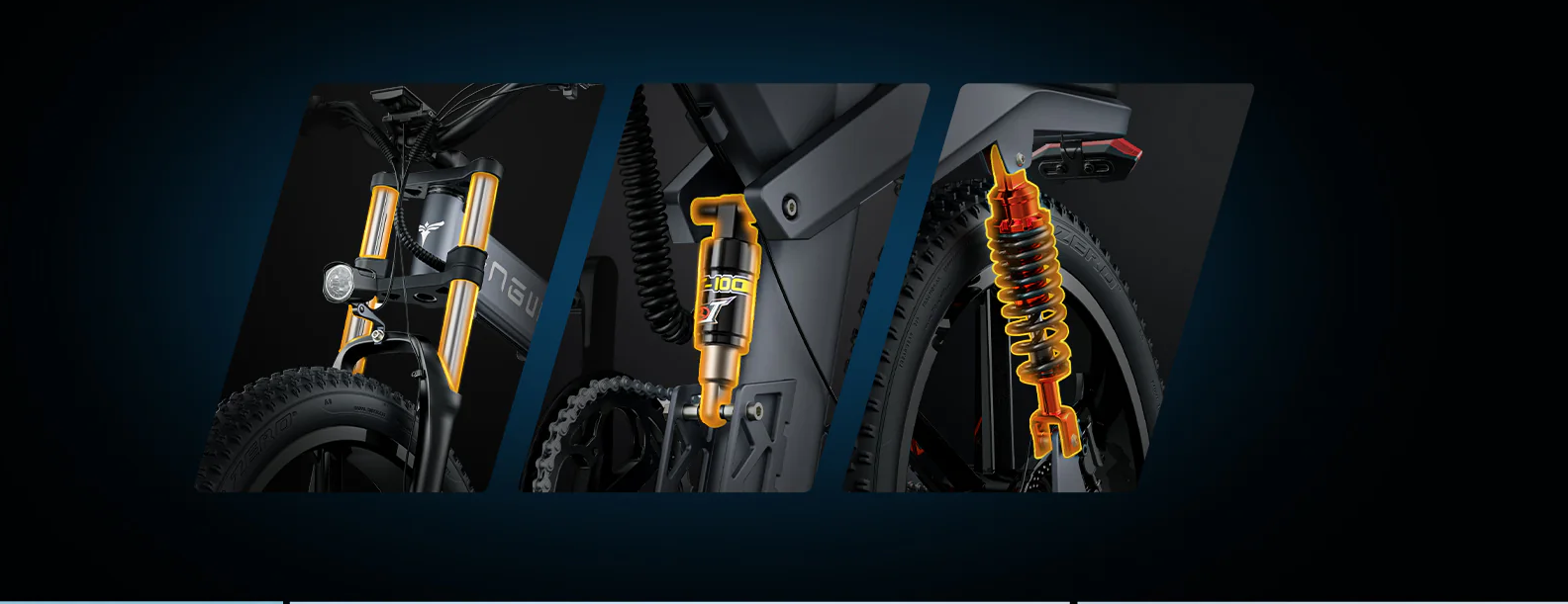 The ENGWE X Series offers 3x more powerful shock absorbance than an average e-bike. This is made possible with a triple shock absorbance system that includes a front hydraulic shock, a middle mechanical shock, and a rear air shock absorber.