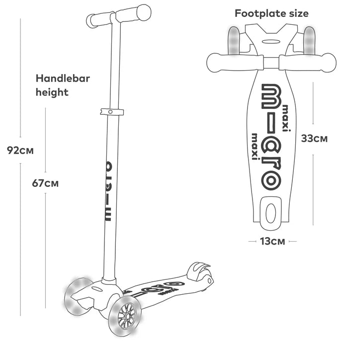 The Maxi Micro Deluxe Glow LED is the ultimate companion for your child's adventures! Experience a ride like no other thanks to the enchanting glow-in-the-dark elements. From the elegant deck to the ergonomic grips and logo, every detail adds a touch of magic. Powered by natural sunlight or artificial UV light, this scooter soaks up energy during the day to light up the night.