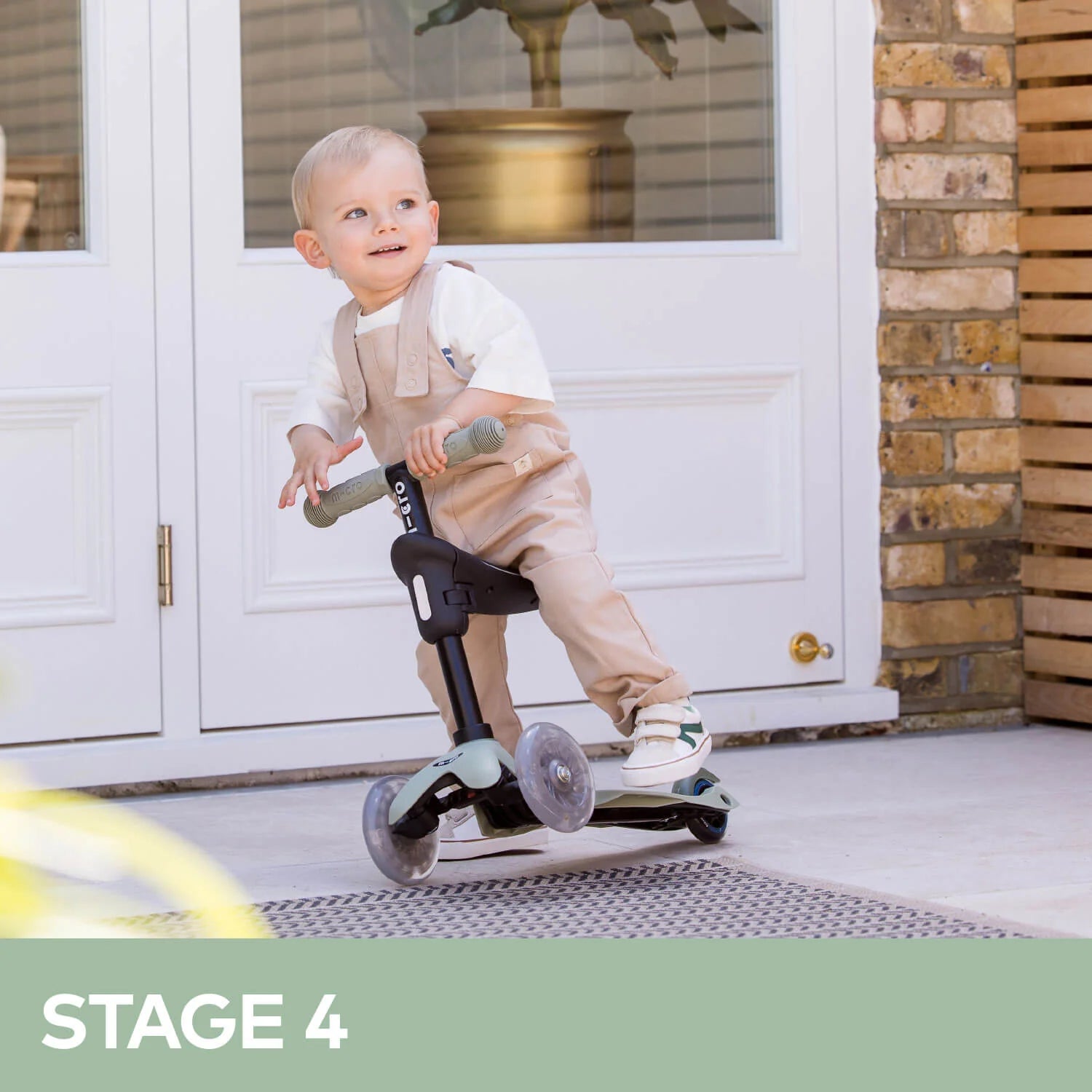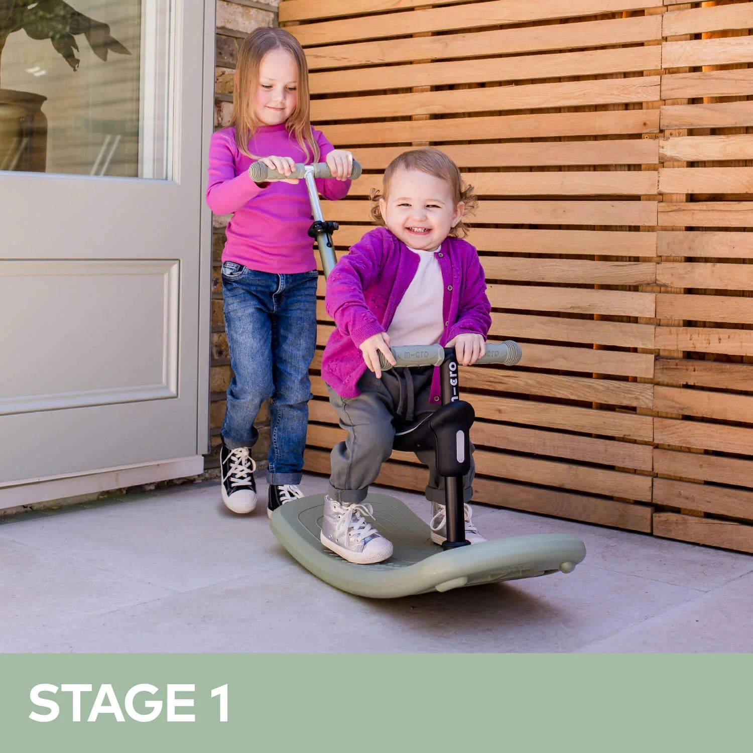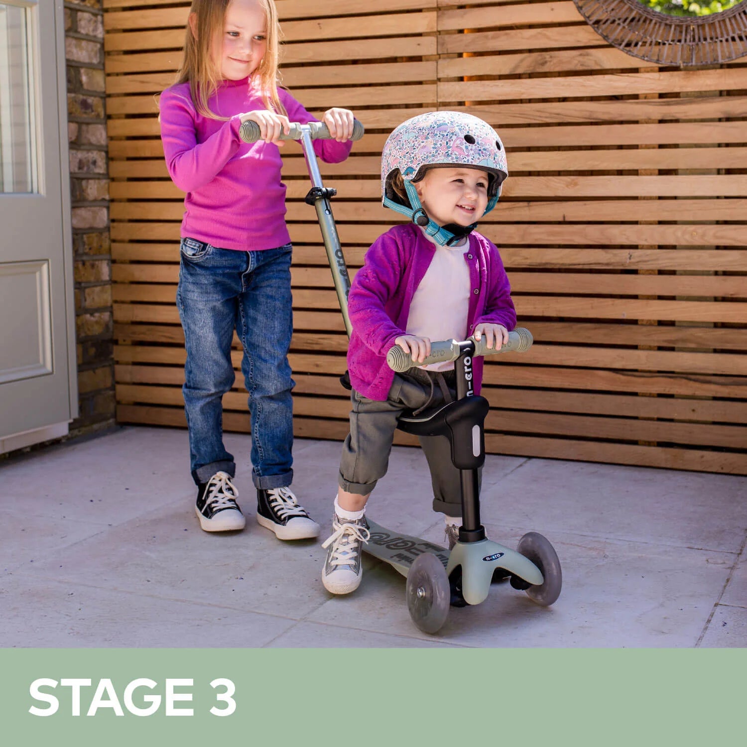 Stage 3 transforms the toy into a Mini Micro ride-on with a seat. This trike encourages independent travel and coordination, helping children gain control and confidence in their movements.